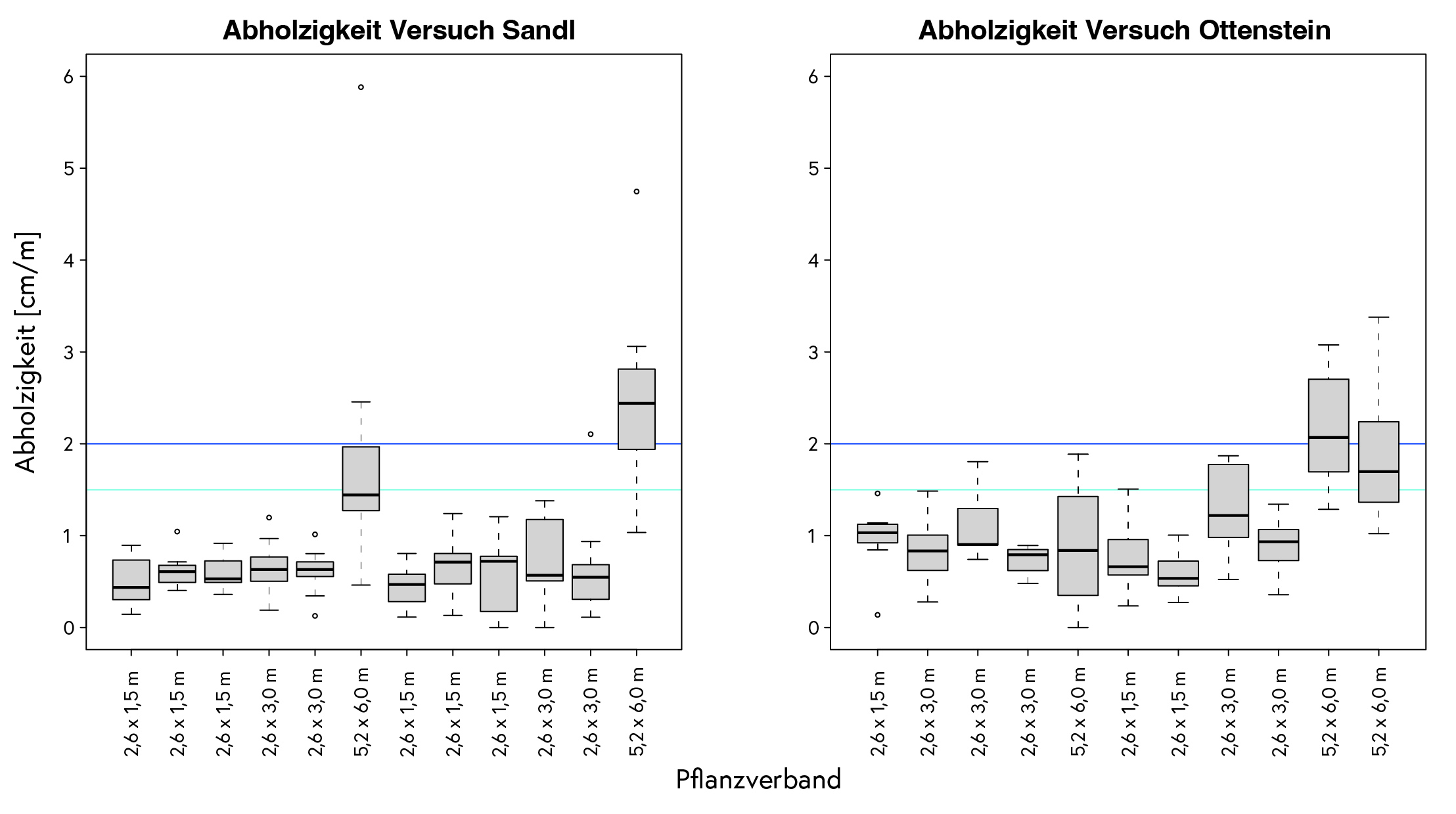 Hinsichtlich der Abholzigkeit unterscheiden die ÖHHU ebenfalls Grenzwerte nach dem MDM. Für Bloche der Güteklasse B mit einem MDM von 20 - 29 cm ist eine Abholzigkeit von maximal 1,5 cm/lfm zulässig, ab einem MDM von 30 cm werden 2 cm/lfm toleriert. Die Abholzigkeit auf den Flächen mit dem engsten Pflanzverband blieb mit einer einzigen Ausnahme bei allen Bäumen (98,8 %) unter 1,5 cm/lfm und somit in der Güteklasse B. Auf den Versuchsflächen, welche im Pflanzverband 2,6 x 3,0 m begründet wurden, fielen aufgrund der Abholzigkeit 93,3 % der Erdstämme in die Güteklasse B, der Rest jeweils in Güteklasse C. Auf den Weitverbandsflächen überschritt die Abholzigkeit bei 39 % der Bäume die Grenze von 2 cm/lfm, wodurch sie als Güteklasse C klassifiziert wurden, der Rest von 61 % fiel jedoch in Güteklasse B.