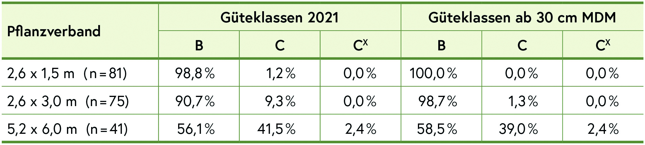 Bei den Bäumen auf den Weitverbandsflächen wiesen bereits alle bis auf einen Baum einen MDM ≥ 30 cm auf. Bloche dieser Stärke dürfen für die Güteklasse B eine unbegrenzte Anzahl an nicht fest verwachsenen Ästen aufweisen, sofern die Astdurchmesser 40 mm nicht überschreiten. Bezogen auf die Astigkeit, fielen beim engen Pflanzverband 98,8 % und beim mittleren Pflanzverband 90,7 % der begutachteten Erdstämme in die Güteklasse B. Übersteigt durch weiteres Wachstum der MDM dieser Erdstämme 30 cm, erhöhen sich die Anteile der Güteklasse B auf 100 % bzw. 98,7 %. Der jeweilige Rest auf 100 % würde in die Güteklasse C fallen. Auf den Weitverbandsflächen (5,2 x 6,0 m) zeigt sich ein etwas anderes Bild. Der Anteil der Erdstämme, welche die Kriterien hinsichtlich der Astigkeit für die Güteklasse B nicht erreichen, liegt bei 43,9 %. Bloche der Güteklasse C dürfen ab einem MDM von 30 cm eine unbegrenzte Anzahl nicht fest verwachsener Äste aufweisen, sofern deren Astdurchmesser 50 mm nicht übersteigt. Lediglich der Erdstamm eines Baumes konnte dieses Kriterium nicht erfüllen und ist somit in die Güteklasse Cx gefallen.