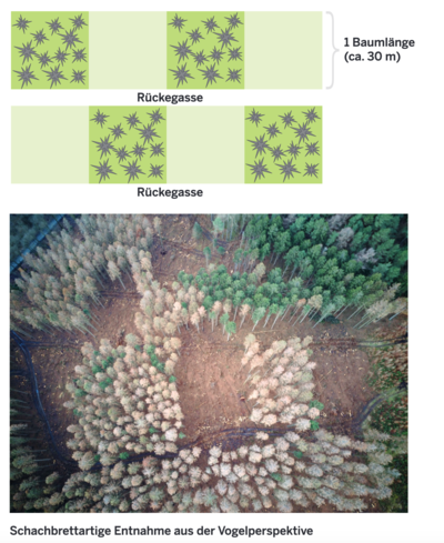 Abb. 4: Anlage von schachbrettartig angelegten Kleinflächen mit Fichten-Entnahme. Foto: Carsten Arndt, Abb. oben Praxisleitfaden.