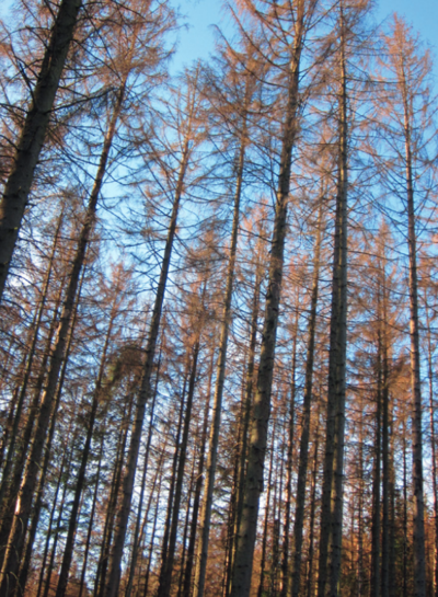 Abb. 2: Fichten-Dürrständer im April 2020 nach Borkenkäferbefall im Herbst 2019. Foto: Bertram Leder