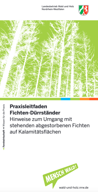 Der neue Praxisleitfaden vom Landesbetrieb Wald und Holz Nordrhein-Westfalen zeigt hier Lösungen auf. Die Experten von Wald und Holz NRW haben gemeinsam mit der Praxis Hinweise für diese Not- und Ausnahmesituation erarbeitet. Obwohl und gerade weil die bisherigen Erfahrungen mit Dürrständern begrenzt sind und sich einige der vorgeschlagenen Lösungsansätze noch in der Erprobungsphase befinden, werden in er Broschüre Vorschläge zum Umgang mit stehendem Fichten-Dürrholz gemacht.