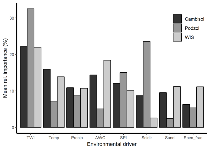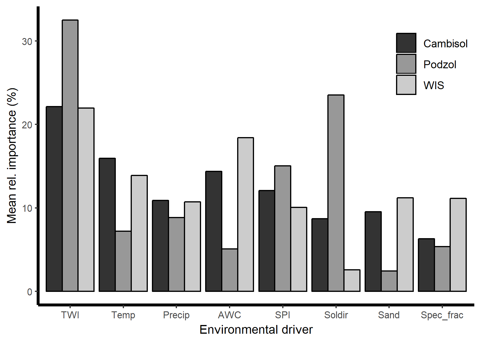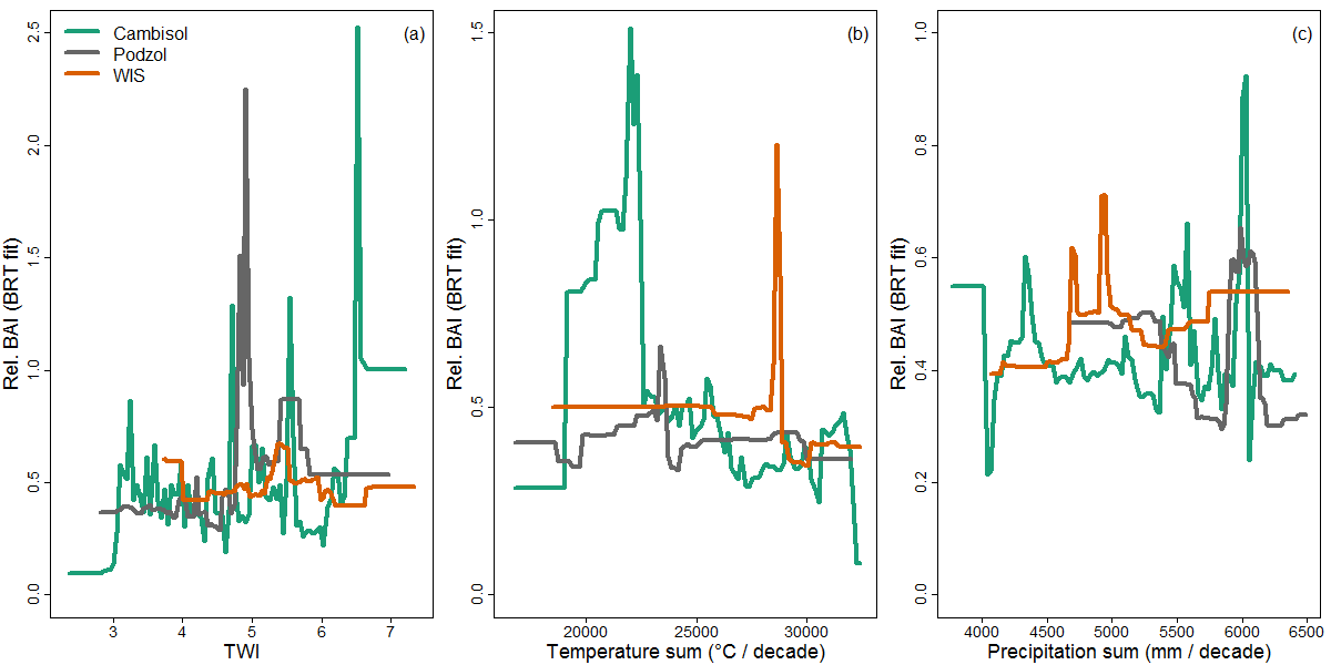 Die Ergebnisse der Studie zeigen deutlich, dass der topographische Feuchteindex (TWI), als Stellvertreter der Wasserverfügbarkeit im Boden, unabhängig von der Bodenklasse einen entscheidenden Einfluss auf den Einzelbaumzuwachs der Fichte aufweist. Abhängig von der Bodenklasse haben Reliefeigenschaften einen großen Einfluss auf den Zuwachs. Der Einfluss der Einstrahlung (soldir) ist auf Podsolen höher als wasserbeeinflussten Böden (Abbildung 2). Im Detail hatte der topographische Feuchteindex, die Temperatur und der Niederschlag einen großen Einfluss auf den relativen Einzelbaumzuwachs der Fichte. Diese Ergebnisse untermauern aktuelle Studien, die mit Methoden aus den Bereichen des maschinellen Lernens sowie linearen oder additiven Modellen ähnliche Fragestellungen bearbeiteten.
