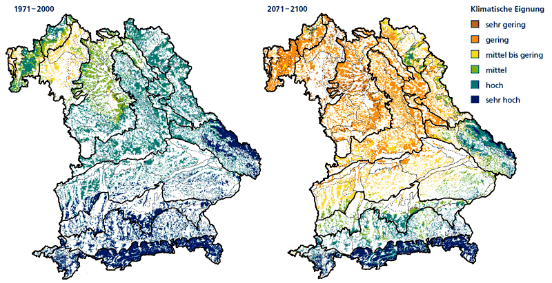 Das mittlere Emissionsszenario A1B geht im Januar von einer Erwärmung zwischen 3,7 bis 6,4 °C, im Sommer zwischen 2,8 und 4,9 °C aus. Die Regionalisierung zeigt, dass unter diesen Bedingungen das Anbaugebiet auf die höchsten Lagen der Alpen und einige Höheninseln der Karpaten schrumpft (Abb. 6). Erst in Schottland und Norwegen finden sich dann wieder Regionen, in denen auch in Zukunft ein Anbau der Europäischen Lärche aus klimatischer Sicht erfolgversprechend ist. Abb. 7 zeigt das Bild für die Regionen Bayerns für die bisherigen Klimabedingungen. Selbst bei der Annahme des sehr milden Szenarios B1 wird die hohe Verwundbarkeit der Hochgebirgsbaumart Lärche außerhalb der hohen Gebirge sichtbar (Abb. 8).