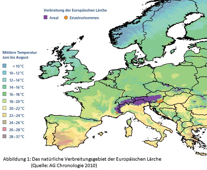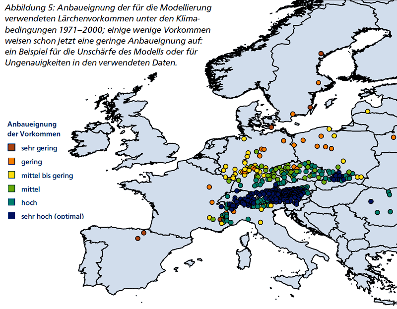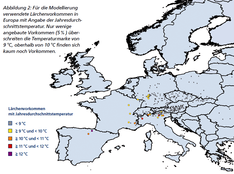 Vorkommen über 9 °C sind sehr selten (Abb. 2). Die warmen Regionen Europas werden demnach sowohl von den natürlichen Vorkommen als auch von den Lärchenanbauten systematisch gemieden. Tatsächlich treten in den warm-trockenen Teilen des Anabaugebiets vermehrt Schäden durch z.B. Lärchen-Borkenkäfer und Lärchen-Bockkäfer auf. Daneben ist mit Dürreschäden und bei gleichzeitiger Spätfrostneigung auch mit Pilzerkrankungen wie dem Lärchenkrebs zu rechnen. Die Nische der Art wird als Ganzes durch hohe Temperaturen begrenzt. Selbst die Provenienzen mit dem wärmsten Klima (Polenlärche, Sudetenlärche, Wienerwaldlärche, Tieflagenherkünfte der Alpen) befinden sich unterhalb der genannten Temperaturschwelle. Einige Herkünfte aus wärmeren Regionen zeichnen sich durch ausgesprochene Krummwüchsigkeit aus.