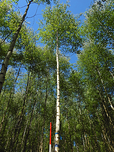 - Im mittleren Bestandesalter gehen die in der Jugend starken Eingriffe zu mäßigen, im höheren Alter zu schwachen Entnahmen über. Sie entsprechen damit einer gestaffelten Durchforstung. Mit fortschreitendem Alter werden die Birkenbestände durch die Holzentnahme zunehmend lückiger. Dies ist der Moment, durch Voranbauten die nächste Waldgeneration anzulegen (Ober¬höhe der Birken 18 bis 21 m). So entstehen standortgerechte Mischbestände aus licht- und schatten¬ertragenden Baumarten.