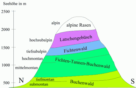 Die meisten Wuchsgebiete umfassen eine Zonierung in mehrere Höhenstufen. Diese stellen in vertikaler Richtung aufeinanderfolgende Klima- und Vegetationsgürtel dar, welche die regionale Eigenart der Wuchsgebiete überlagern. Die einzelnen Höhenstufen sind primär nach klimatisch-pflanzensoziologischen Gesichtspunkten und nicht nach bestimmten Seehöhenwerten definiert. In Abb. 3 ist schematisch die Höhenstufengliederung für das Hauptwuchsgebiet Nördliche Randalpen dargestellt.