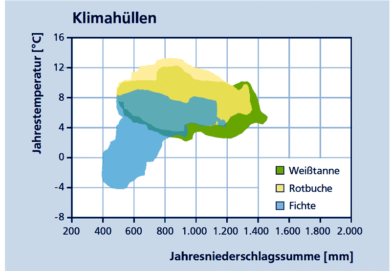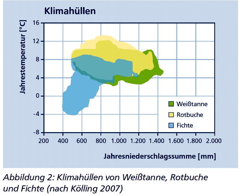 Ein Vergleich der Klimahüllen zeigt, dass die Tanne eine charakteristische Position zwischen der Fichte und der Rotbuche einnimmt (Abb. 2). Die drei Baumarten mischen sich in einem bestimmten Temperatur- und Niederschlagsbereich und bauen natürlicherweise strukturreiche Bergmischwälder auf. Hin zu wärmeren Temperaturen verschwindet zunächst die Fichte, dann die Weißtanne und zuletzt bleibt die Rotbuche übrig.