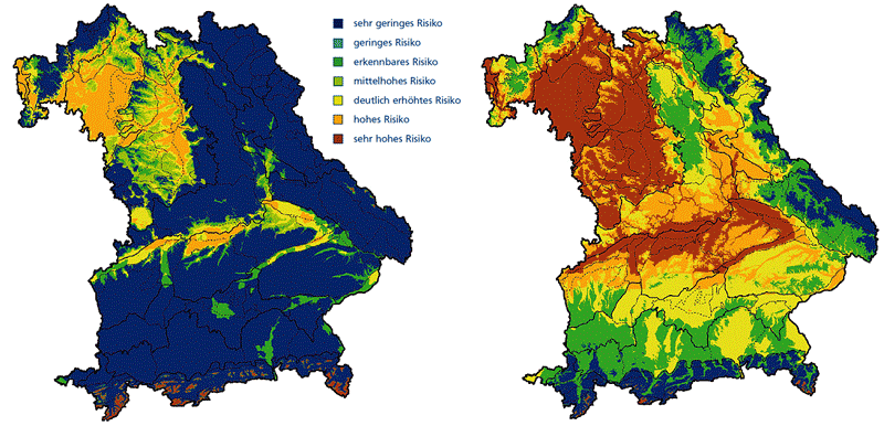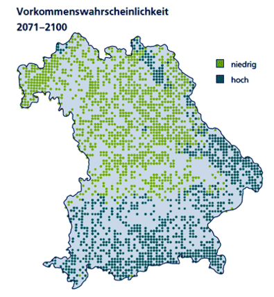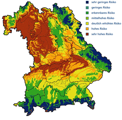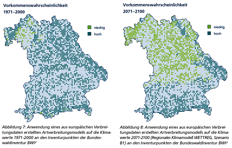 Die daraus entstehende Karte offenbart eine Zunahme des Anbaurisikos in vielen Regionen Bayerns. Die Gebiete mit sehr geringem Anbaurisiko (blau) schrumpfen auf die ausgeprägten Gebirgslagen zusammen. Neben den Karten für die Weißtanne gibt es auch welche für Fichte, Rotbuche, Eiche (Trauben- und Stieleiche), Bergahorn, Europäische Lärche, Waldkiefer und Douglasie.