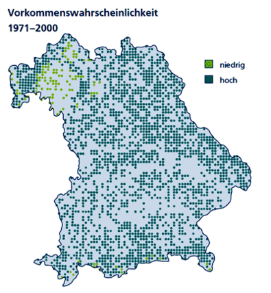 Die Beziehung zwischen dem Vorkommen der Arten und den herrschenden Standortsbedingungen sollen noch präziser und transparenter erfasst werden. Die zugrunde gelegten Artverbreitungsmodelle beziehen zahlreiche Standortsfaktoren gleichzeitig ein und beschreiben das Potential für den Tannenanbau. Das Ergebnis sind Vorhersagemodelle, die für die Gegenwart (Abb. 7) und die Zukunft (Abb. 8) unterschiedliche Wahrscheinlichkeiten des Vorkommens der Weißtanne ergeben. In der Gegenwart ist es fast auf der ganzen Landesfläche möglich Weißtannen erfolgreich anzubauen. In der Zukunft verringern sich diese Regionen ganz beträchtlich. Lediglich in vereinzelten Punkten im Gebirge verbessert sich die Lage.