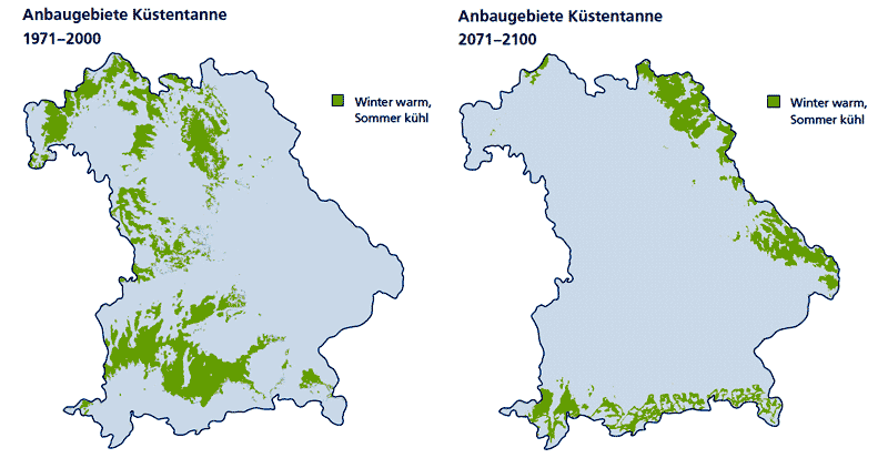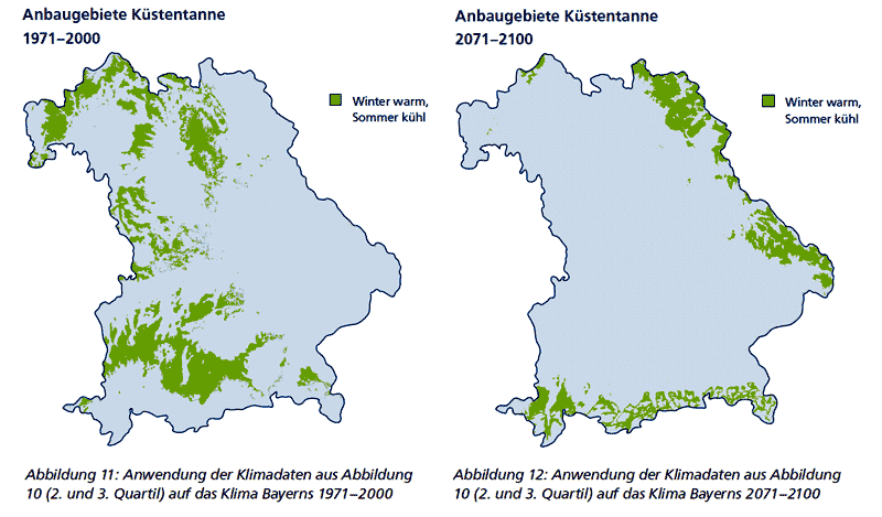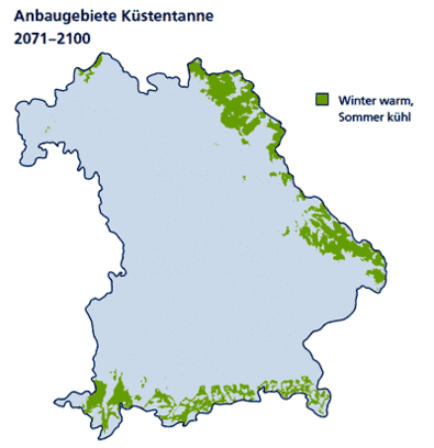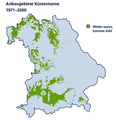 Im küstennahen Teilareal herrschen im Vergleich zum Klima Deutschlands kühlere Sommer und wärmere Winter. Mögliche Anbaugebiete der Küstentanne liegen bei dem gegenwärtigen Klima in den (sub-)atlantisch geprägten Regionen Bayerns (Abb. 11). Im Klimawandel verlagern sich diese Gebiete in die höheren Mittelgebirge und in die Alpen (Abb. 12).