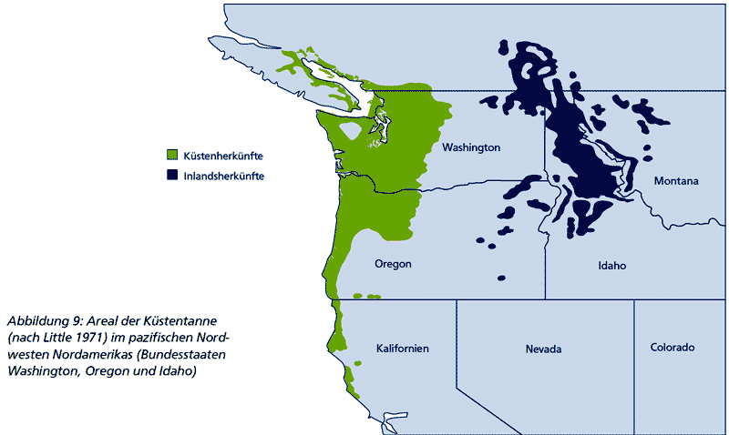 Die Heimat der Küstentanne (Abies grandis) liegt im pazifischen Westen Nordamerikas (Abb. 9). Ihr Areal ist zweigeteilt. Das Klima im Küstenareal ähnelt in gewisser Weise dem Klima bei uns, das Inlandsareal hat dagegen ein völlig anderes Klima (Abb. 10). Daher werden für den Anbau in Bayern nur die Küstenherkünfte verwendet.