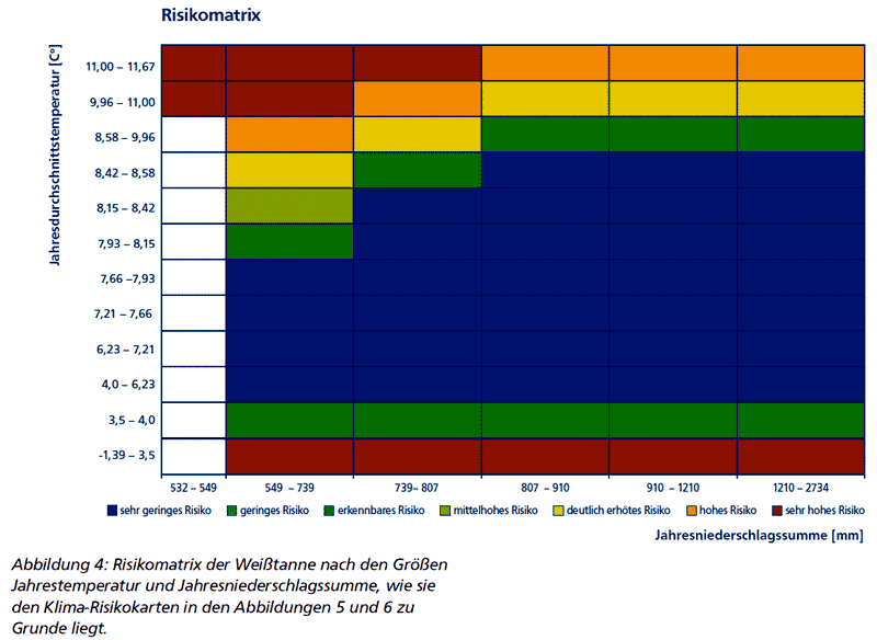 Abb. 5: Regionalisierung der Risikomatrix der Weißtanne mit den Klimawerten der Periode 1971-2000.
