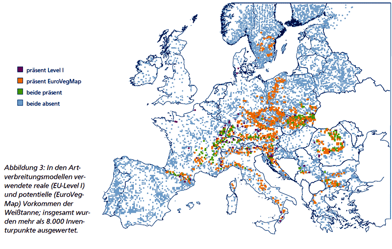 Ausgehend von den Klimahüllen wurden Artverbreitungsmodelle entwickelt, die die Übertragung der Schwellenwerte auf die Fläche erlauben. Bei der Modellbildung wurden reale und potentielle Tannenvorkommen (Abb. 3) verwendet. Diese Vorkommen werden mit Klimadaten verbunden. Dadurch entsteht eine Risikomatrix (Abb. 4), die die Verteilung der europäischen Weißtannen widerspiegelt.