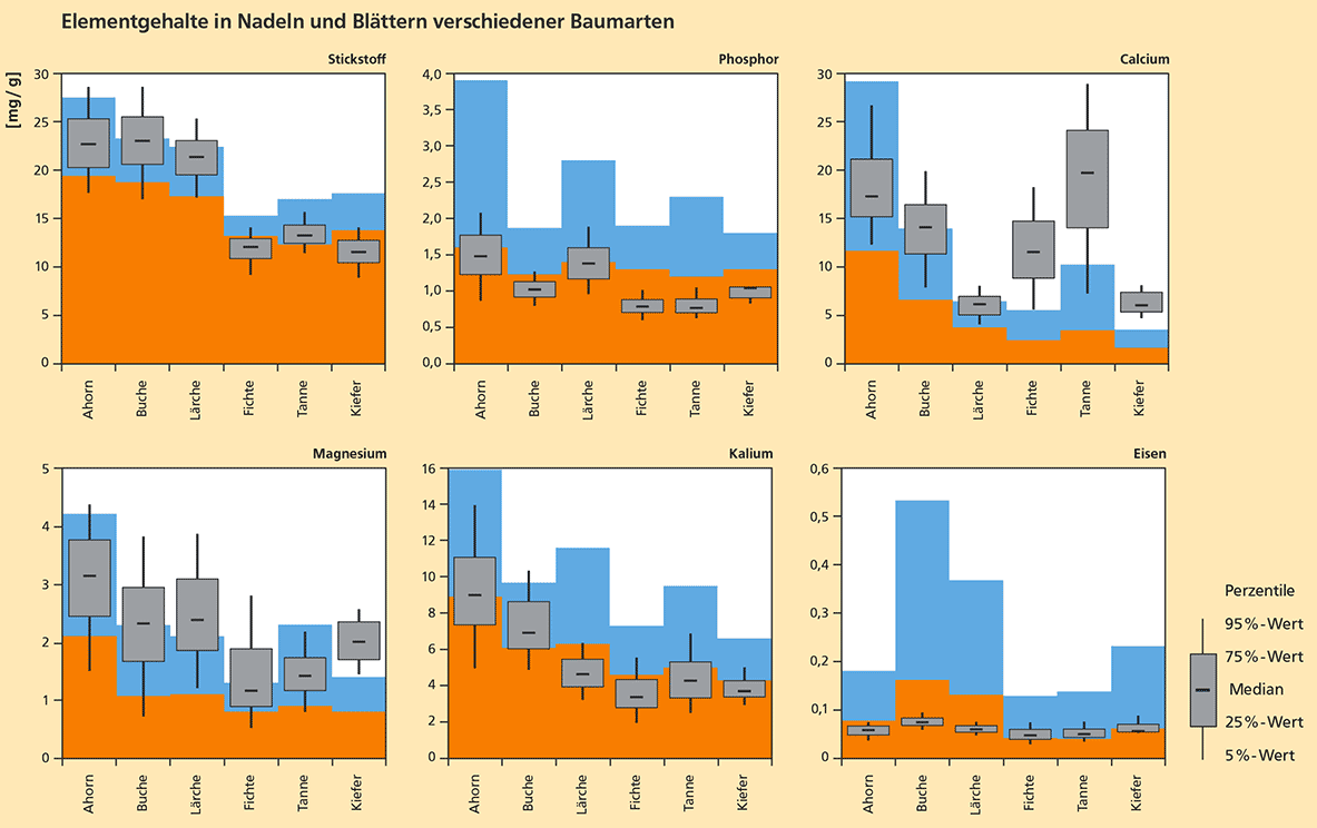 Die Nährstoffgehalte in allen Baumkompartimenten zeigen trotz der von Calcium dominierten Bodenchemie deutliche und signifikante baumartenspezifische Unterschiede. Bergahorn und Buche zeichnen sich durch hohe Nährelementgehalte in allen Kompartimenten und damit durch ihren hohen Nährstoffbedarf aus. Mit Ausnahme von Calcium befinden sich ebenfalls hohe Nährelementkonzentrationen in Lärchennadeln. Die geringen Gehalte in deren Zweigen, Rinde und Holz sprechen für eine hohe Effizienz der Nährstoffverwertung. Die immergrünen Nadelbäume haben niedrigere Konzentrationen der Hauptnährelemente, zeigen dafür höhere Werte an Mangan (Fichte und Tanne) und Eisen (Kiefer). Die besonders geringen Nährelementgehalte in Holz und Rinde bei Kiefer belegen, dass sich diese Baumart bestens an nährstoffarme Standorte anpassen und die Nährstoffe sehr effizient ausnutzen kann.