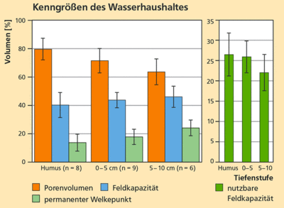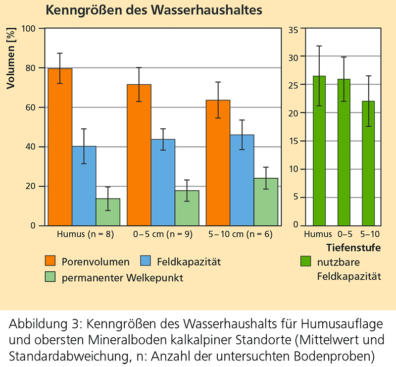 Die vorherrschenden flachgründigen Böden im Kalkalpin haben meist entweder eine deutliche Humusauflage oder einen hohen Humusanteil im oberen Mineralboden. Beide Horizonte besitzen ein Gesamtporenvolumen zwischen 60 und 80 Prozent. Das ist, verglichen mit üblichen Mineralbodenhorizonten mit Porenvolumina zwischen 35 und 50 Prozent, sehr hoch. Die nutzbare Feldkapazität liegt aufgrund des hohen Grobporenanteils allerdings nur bei etwa 25 Prozent (Abb. 3). Das ist vergleichbar mit für die Wasserversorgung günstigen Schluffböden.