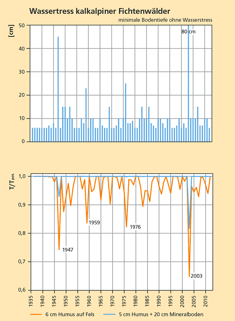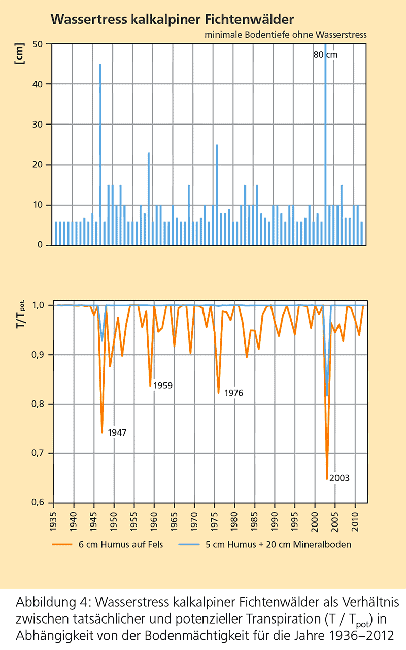 Für die meisten charakteristischen Klimawerte und Bodenmächtigkeiten des nördlichen Kalkalpins wurden Wasserhaushaltsmodellierungen durchgeführt. Abbildung 4 zeigt das Verhältnis zwischen der tatsächlichen Transpiration und der bei optimaler Wasserversorgung potenziell möglichen Transpiration. Je kleiner dieses Verhältnis ist, desto stärker leidet der Waldbestand unter Trockenstress. Zusätzlich ist die minimale Bodentiefe dargestellt, bei der keine Transpirationseinschränkung errechnet wurde. Starker Wasserstress trat nur selten auf. Deutlich sind die Trockenjahre 2003 und 1947 erkennbar, in abgeschwächter Form auch 1959 und 1976. Auffällig ist, dass flachgründige Standorte deutlich anfälliger gegenüber Wasserstress sind.