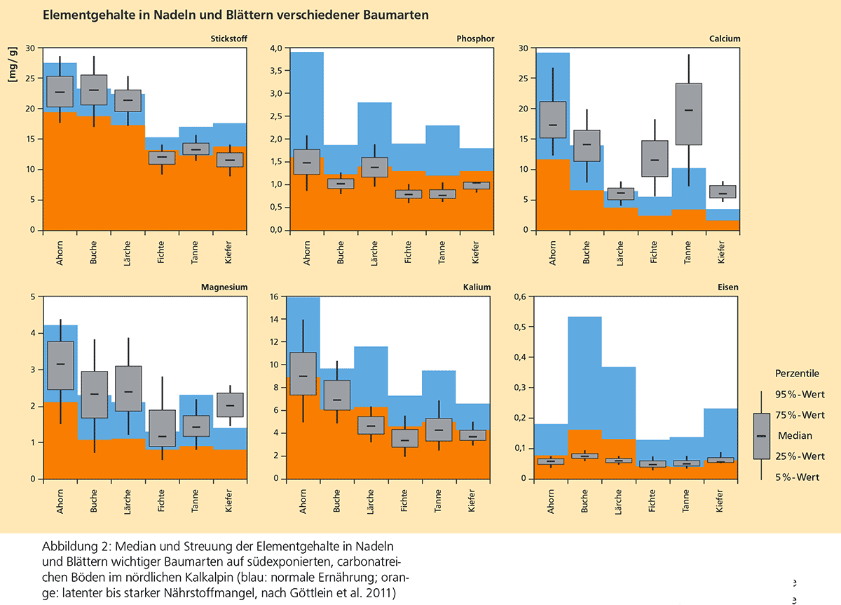 Tiefgründige Böden aus basenreichem Flysch oder ähnlichem Ausgansmaterial sind durchgehend gut mit Nährstoffen versorgt. Auf Kalk und Dolomit treten jedoch Nährstoffmängel bei praktisch allen Baumarten auf (Abb. 2). Dabei haben Humusmächtigkeit, Bodentiefe bis zum anstehenden Fels und Höhenlage nur einen geringen Einfluss. Laubabwerfende Baumarten haben hier eher Probleme bei der Versorgung mit Kalium und Eisen, immergrüne Nadelbäume hingegen bei der Aufnahme von Phosphor, teilweise von Stickstoff und Kalium.