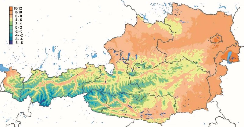 Abbildung 1 zeigt die Verteilung des langjährigen Jahresmittels der Lufttemperatur in Österreich. Naturgemäß spiegelt sich das Relief darin wieder, deutlich zu erkennen ist der Alpenbereich. Die wärmsten Gebiete liegen im Osten (Weinviertel) und Südosten; Mühl- und Waldviertel dagegen sind durch relativ kühle Temperaturen geprägt.