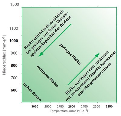 Für die Fichte ist ein jährlicher Niederschlag von mehr als 600 mm, davon mindestens 300 – 350 mm in der Vegetationszeit, erforderlich. Ab einer Temperatursumme von 3050 °C steigt die Anfälligkeit gegenüber Sekundärschädlingen und die Konkurrenzkraft nimmt ab (Abbildung 2).
