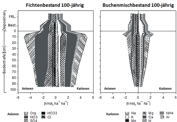 Sowohl die Stoffeinträge mit dem Niederschlag als auch die Austräge mit dem Bodensickerwasser unterscheiden sich deutlich zwischen den verschiedenen instrumentierten Bestandesvarianten. Der Vergleich der Ionenflüsse für einen 150-jährigen Buchen-Tannen-Fichten-Mischbestand und einen 100-jährigen Fichtenbestand zeigt das Potenzial der Baumartenwahl für den Erhalt geschlossener Stoffkreisläufe (Abb. 2). Die beiden Baumartenvarianten unterscheiden sich am stärksten beim Nitratfluss. Dieser ist im Buchen-Mischbestand vernachlässigbar niedrig, während er den Stoffhaushalt des Fichtenbestandes dominiert. Im Fichtenbestand treiben außerdem hohe Sulfatflüsse unterhalb 60 cm, welche aus der Remobilisierung von aus früheren Depositionen stammenden Schwefelausfällungen resultieren, den Austrag von basischen Kationen an. Im Buchenmischbestand ist die Stoffflussdichte unter der Wurzelzone niedriger als im Eintrag mit dem Niederschlag, wodurch die Nährelementvorräte im Boden weitgehend erhalten bleiben. Das dargestellte Beispiel zeigt, dass durch die Baumartenwahl sowohl ein nennenswerter Beitrag zur Erhaltung der Ernährungsfunktion des Bodens als auch anderer Ökosystemfunktionen wie Säurepufferung und Stickstoffspeicherung geleistet werden kann.
