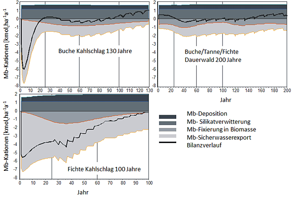 Aus den strukturbezogenen Einzelmessungen wurden kumulative Elementbilanzen für basische Kationen für gesamte waldbauliche Umtriebszeiten abgeleitet (Quelle). Im Untersuchungsgebiet waren 50 für unterschiedliche Bestandesphasen repräsentative Stoffbilanzen verfügbar, die zu unterschiedlichen waldbaulichen Behandlungsstrategien kombiniert wurden. Die Stoffbilanzen ergeben sich aus dem Stoffeintrag mit der Deposition und der Gesteinsverwitterung auf der einen Seite und dem Stoffaustrag mit dem Sickerwasser und dem Holzernteentzug auf der anderen Seite. Der Verlauf der basischen Kationenbilanzen (Ca, Mg, Na und K) über gesamte Umtriebszeiten hinweg wird in Abb. 4 für verschiedene, im Stoffhaushalt stark voneinander abweichende Waldbauverfahren gezeigt. Die beiden Kahlschlagsverfahren zeigen einen Netto-Verlust an basischen Kationen bis zu 5-6 kmolcha-1a-1 in der Kahlschlagsphase. Im Buchenbestand sind 25 Jahre nach der Kahllegung die Bilanzen basischer Kationen wieder ausgeglichen. Im Gegensatz dazu wird im Fichtenbestand ein Verlust basischer Kationen über die gesamte Umtriebszeit hinweg beobachtet. Der Buchen-Tannen-Fichten-Dauerwald erweist sich als die vorsichtigste Behandlungsstrategie, die keine längeren Perioden mit erheblichen Verlusten basischer Kationen aufweist.