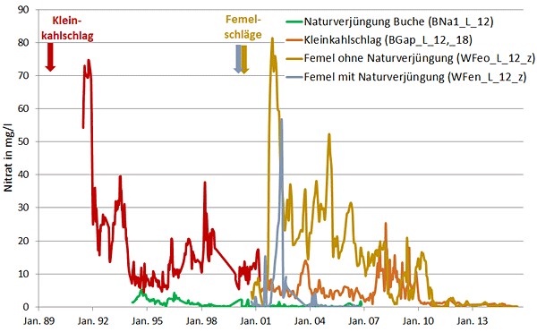 Exemplarisch zeigt Abb. 3 langjährige Nitratmessungen im Bodenwasser in einem Kleinkahlschlag, in zwei Femelschlägen und in einer aufwachsenden Buchennaturverjüngung. Abb. 3 zeigt, wie die Nitratkonzentrationen im Bodensickerwasser nach einem Hieb sprunghaft ansteigen. Die Femelschläge erzeugten im Bodensickerwasser ähnliche Nitratpeaks wie der Kleinkahlschlag, wirkten sich aufgrund ihrer geringeren Fläche aber deutlich weniger auf die Nitratfracht im Gebietsabfluss aus. Auffällig ist die Wirkung aufwachsender Naturverjüngung. Im Femelschlag, in dem zum Zeitpunkt des Hiebes bereits vitale Naturverjüngung vorhanden war, geht die Nitratkonzentration innerhalb weniger Jahre nach dem Hieb auf ihr Ausgangniveau zurück, während im Femelschlag mit fehlender Naturverjüngung bis zu 10 Jahre nach dem Hieb erhöhte Nitratkonzentrationen zu beobachten waren.