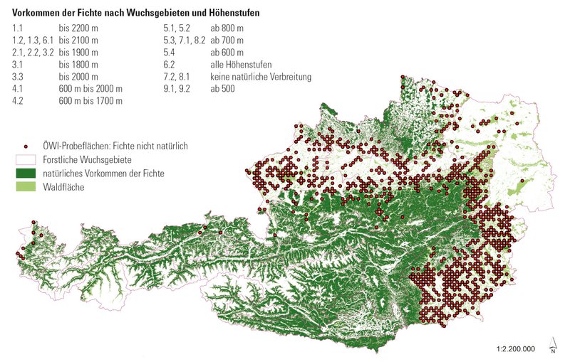 Abbildung 3: Karte sekundärer Fichtenbestände in Österreich. Die Abbildung entstammt einer Arbeit von Schweinzer und Starlinger (2013)