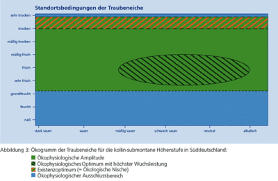 Abbildung 3 stellt das physiologische Spektrum, das Wuchsoptimum und das Existenzoptimum (ökologische Nische) der Traubeneiche für die kollin-submontane Wärmestufe dar. Das außergewöhnlich weite Standortspotenzial der Art findet nur auf feuchten und nassen Standorten eine Grenze.