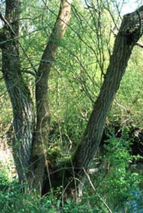 Abb. 2: Natürliche Waldregeneration in der Weichholz-/Hartholz-Übergangsaue: Die Feldulme wächst aus einem vermodernden Weiden-Baumstumpf, flankiert von zwei erstarkten Stockausschlägen der Silberweide (April 2001, Foto: R. Ostermann).
