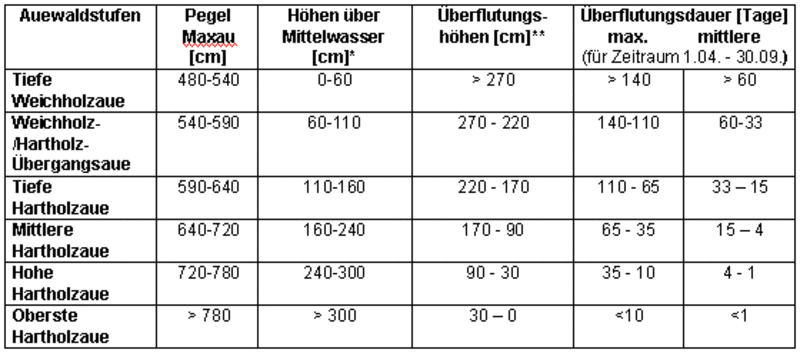 In der Freien Überflutungsaue ist die mittlere jährliche und die maximale Überflutungsdauer in der Vegetationszeit (1.4.-30.9., Bezugsperiode 1968-1999, Bezugspegel Karlsruhe-Maxau) für die Zuordnung der Standorte zu Auewaldstufen entscheidend (Tab. 2). Es werden insgesamt 6 Auewaldstufen definiert. Die unterste Stufe, die Tiefe Weichholzaue, beginnt unmittelbar über dem Mittelwasser des Rheins. Sie wird im Mittel mehr als 60 Tage in der Vegetationszeit überflutet; in extremen Abflussjahren kann sie jedoch die Gesamtdauer der Vegetationsperiode im Wasser stehen. Die höchste Auewaldstufe, die Oberste Hartholzaue, wird demgegenüber nur bei seltenen Extremereignissen wie beispielsweise im Mai/Juni 1999 von Hochwässern erreicht, und auch dann bleibt die Überflutungshöhe gering und die Überflutungsdauer auf wenige Tage beschränkt. Die Oberste Hartholzaue beginnt ab einer Höhenlage von 300 cm über dem Mittelwasser und erstreckt sich bis zu ca. 400 cm über Mittelwasser. Noch höher liegende Flächen müssen der Altaue zugerechnet werden. Innerhalb der Auewaldstufen werden die Standorte nach dem Substrat weiter differenziert.