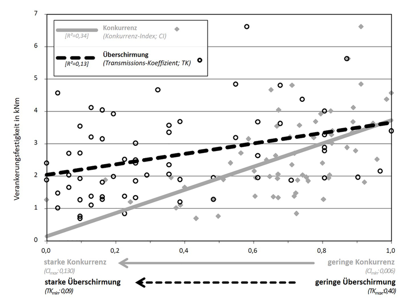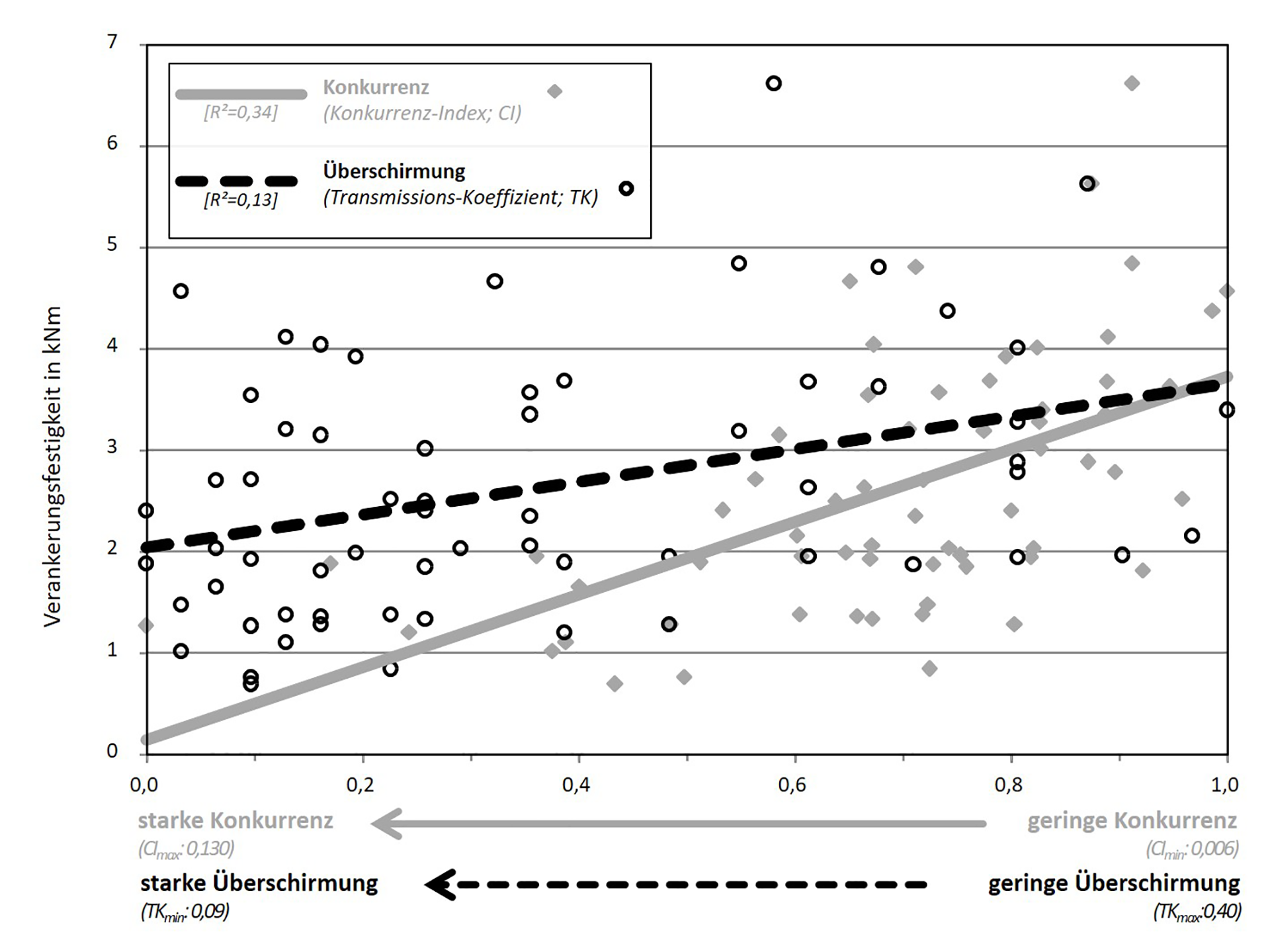 Abb. 3: Auswirkung von Konkurrenz durch Nachbarbäume bzw. von Überschirmung auf die Festigkeit der Wurzelverankerung verjüngter Douglasien. Die Werte des als Konkurrenzindex (CI) gemessenen Einflusses von Konkurrenten bzw. des als Transmissionskoeffizient (TK) gemessenen Einflusses der Überschirmung wurden auf einen Bereich von 0 bis1 standardisiert. Jeweils der Indexwert CI bzw. TK, der den geringsten Einflussgrad repräsentiert, entspricht dem Wert 0, der mit dem stärksten Einfluss dem Wert 1 (verändert nach [58]).