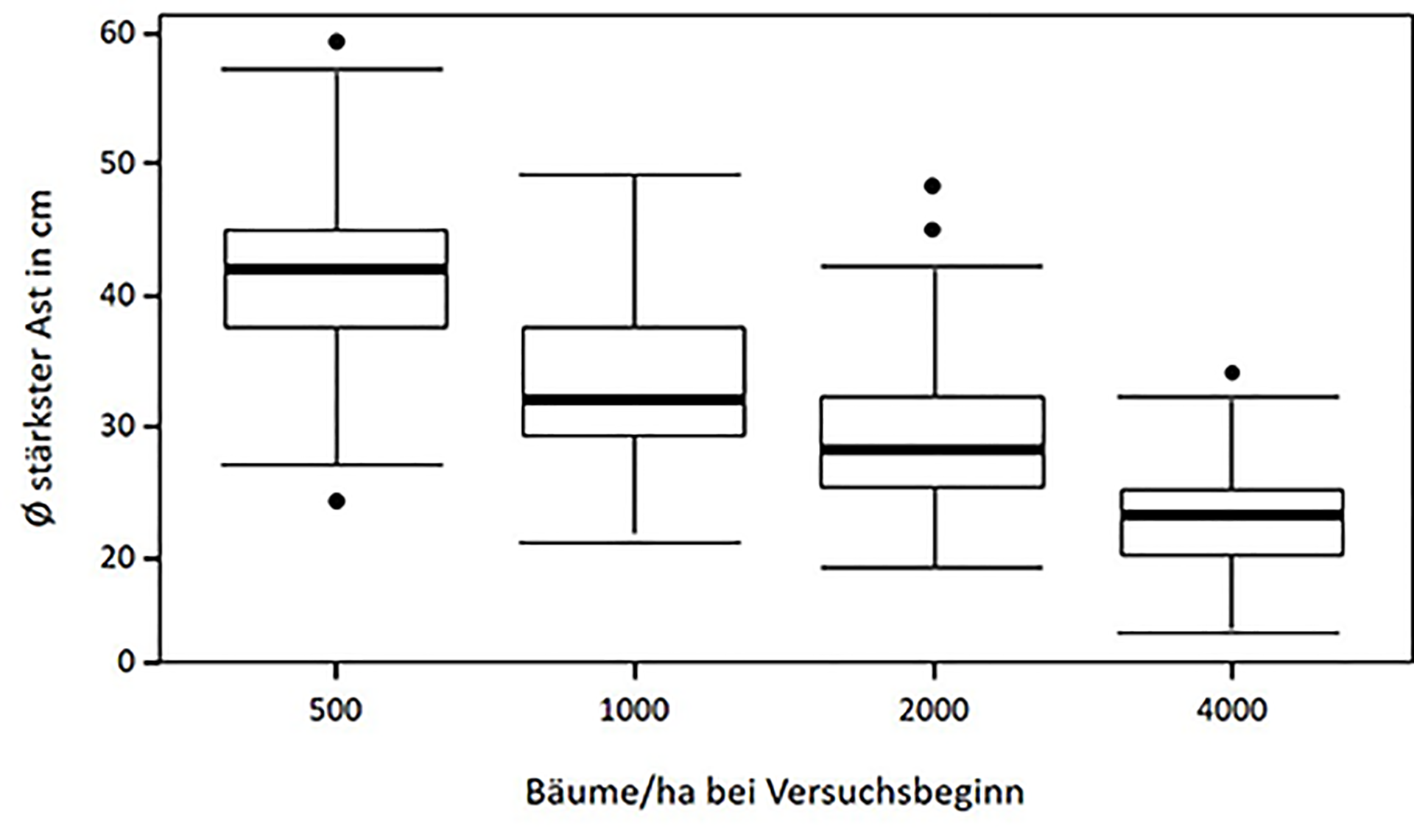 Mit sinkenden Pflanzenzahlen und somit zunehmenden Standräumen profitiert die Durchmesserentwicklung der Bäume von abnehmender Konkurrenz. Einerseits nimmt auch das Verhältnis von Höhe zu Durchmesser (H/D-Verhältnis) ab – allgemein ein guter Indikator für zunehmende Schaftstabilität [50, 43]. Andererseits nimmt jedoch - wie zum Beispiel auch bei Fichte [49, 3] - die Stärke der Äste eindeutig zu (Abb. 4), [32]. Der Ausgleich zwischen dem Einfluss der Standraumdynamik auf die Entwicklung von Stammdurchmesser und Aststärke ist daher eine ertragswirtschaftliche Optimierungsaufgabe.
