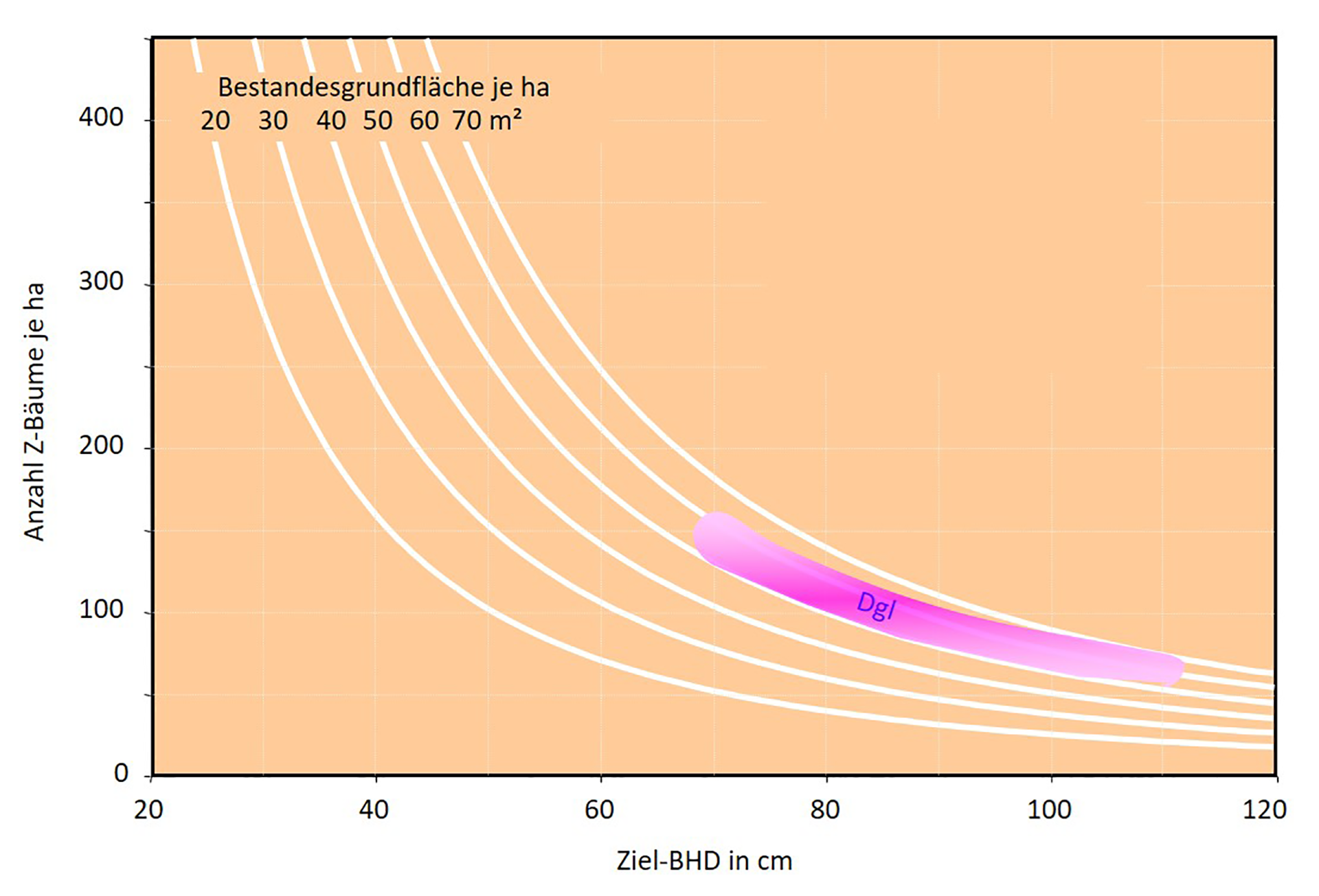 Höher gelegene Abschnitte können erst später geästet werden. Dafür muss dann zwangsläufig der Zieldurchmesser angehoben werden: Soll ein zweiter Abschnitt vergleichbarer Länge geästet werden, ist ein Zieldurchmesser von 80 bis 90 cm in Brusthöhe erforderlich, um auch beim zweiten Abschnitt einen ausreichend starken astfreien Mantel erzeugen zu können. Diese notwendige Anhebung des Zieldurchmessers bedingt ihrerseits eine Verringerung der Anzahl von Z-Bäumen (Abb. 6).