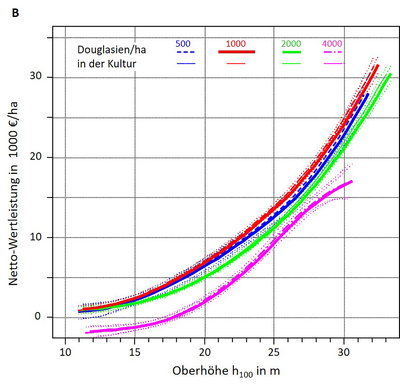 Abb. 5: Gesamtwuchsleistung an Volumen (A) und Netto-Wertleistung durch Stammholzproduktion (B) in Douglasienbeständen, die mit unterschiedlichen Ausgangsbaumzahlen gepflanzt wurden (Vertrauensbereich in gestrichelten Linien).
