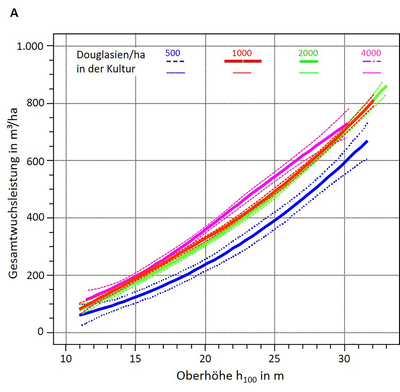 Mit ihrem enormen Wuchspotenzial gehören Douglasien in Mitteleuropa zu den produktivsten Nadelbäumen; ihr Wuchspotenzial liegt in Frankreich und Deutschland generell über dem von Fichte: