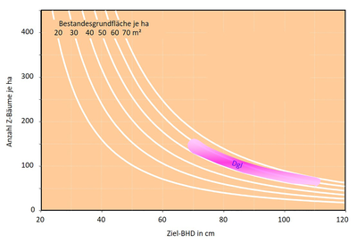 Aus diesen Zusammenhängen lässt sich je nach Ziel der Waldbesitzenden eine optimale Standraumhaltung aus Pflanzdichte und Durchforstungsintensität herleiten Zu berücksichtigen ist, dass dabei hinsichtlich der empfohlenen Grundfläche der hiebsreifen Bestände regionale und/oder nationale Unterschiede bestehen. So wird in Frankreich empfohlen, dass die Bestände, die mit einer Zielstärke von 55 bis 65 cm Brusthöhendurchmesser (BHD) bewirtschaftet werden, Grundflächen von 40 bis 45 m²/ha nicht überschreiten sollten [59]. In Deutschland bewegen sich die Empfehlungen bei dieser Zielstärke dagegen im Bereich von 50 bis 60 m²/ha [29].