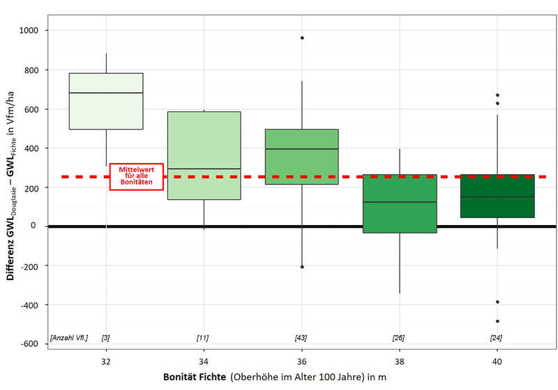 Abb. 2: Unterschiede in der Gesamtwuchsleistung (GWL; Vfm/ha) zwischen benachbarten Douglasien- und Fichten-Versuchsflächen in Südwestdeutschland, dargestellt entlang eines Gradienten von 5 Bonitätsklassen der Fichte. Die Vergleichsmethodik ist in [34] beschrieben. Es handelt sich um orientierende Bonitätsvergleiche +/- nahegelegenen Fichten- und Douglasien-Versuche. Für die Abbildung wurden die in der Veröffentlichung aufgeführten Wachstumsdaten von Douglasie und Fichte neu analysiert (verändert nach [42]).