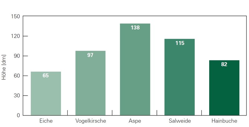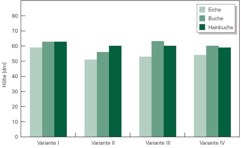 Versuchsfläche Mauerbach. Beispiel für spannungsarme Mischung (geringer zwischenartlicher Konkurrenzdruck) während der Dickungsphase. Mittlere Höhe der in unterschiedlichen Trupp- Varianten gepflanzten Traubeneichen und der sie umgebenden Buchen und Hainbuchen aus Naturverjüngung nach zwölf Vegetationsperioden.