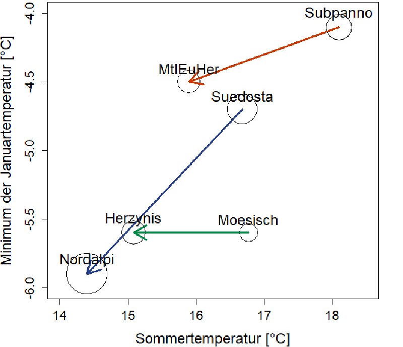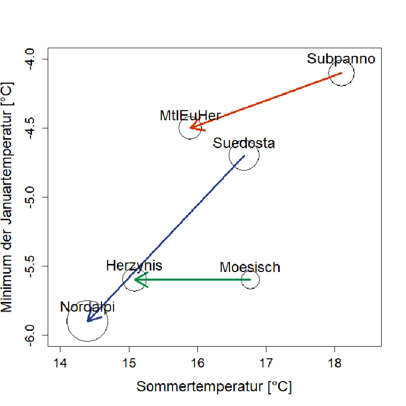 Abb. 4: Schema zur Vorauswahl geeigneter Ersatzherkünfte der Buche aus einer Kombination von Minimumtemperaturen im Januar mit den Sommertemperaturen [°C] und den Sommerniederschlägen [mm] (Blasengröße); Beispiele für wärmere Herkunftsregionen und Zielregionen mit einem Sommertemperaturunterschied von etwa 2 °C sind mit farbigen Pfeilen verbunden, die auf das Zielgebiet zeigen.