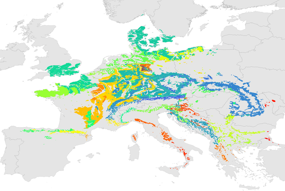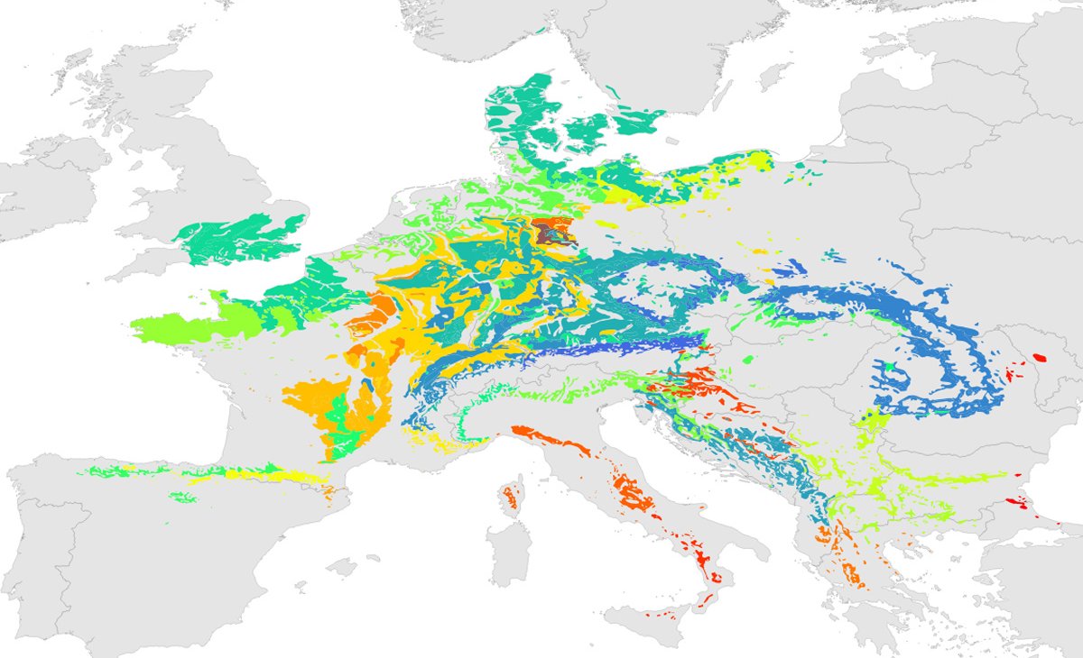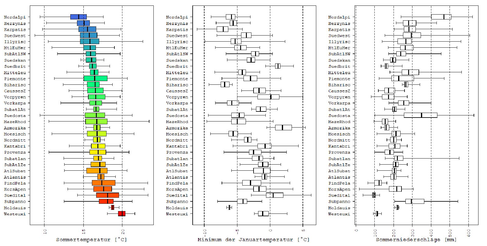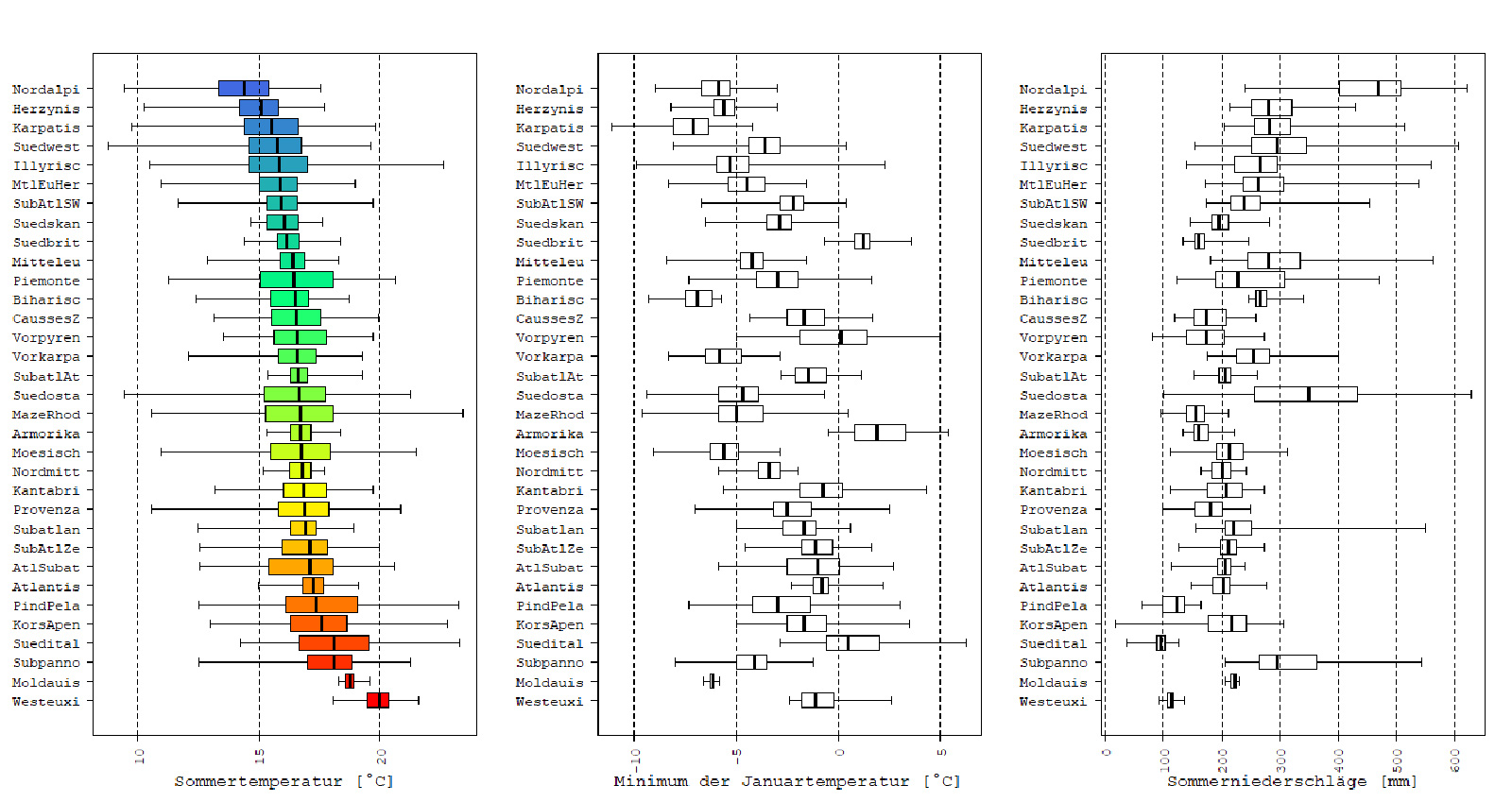Die Vorauswahl von alternativen Herkünften soll am Beispiel zentraleuropäischer (Mittel-)Gebirgswälder gezeigt werden, deren Baumarten im Fokus dieser Studie stehen. Buchenherkünfte aus diesen Gebieten sind durch Anpassungen an tiefe Januartemperaturen, mäßig warme Sommer (grün bis blaugrün in Abb. 2) und meist relativ hohe Sommerniederschläge geprägt (Abb. 3).