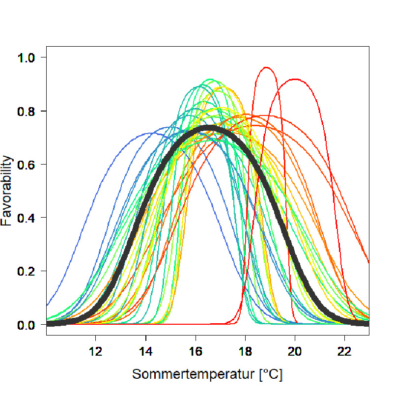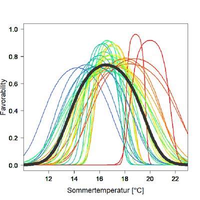 Die Buche ist nach der letzten Eiszeit aus Glazialrelikten nach Zentraleuropa zurückgewandert. Durch die prähistorischen Wanderwege der Buche und den dabei erfolgten Genaustausch einerseits sowie durch die Isolation von Populationen andererseits haben sich durch Selektion und Anpassung mannigfaltige Ökotypen (syn. Herkünfte, Provenienzen) der Buche mit unterschiedlichen Spezialisierungen herausgebildet. Die spezifischen Eigenschaften der Fülle vorhandener Ökotypen (veranschaulicht durch farbige Kurven in Abb. 1) können über spezielle Nischenmodelle abgeschätzt werden. Herkömmliche Nischenmodelle bilden dies nur unzureichend ab (schwarze Kurve in Abb. 1).