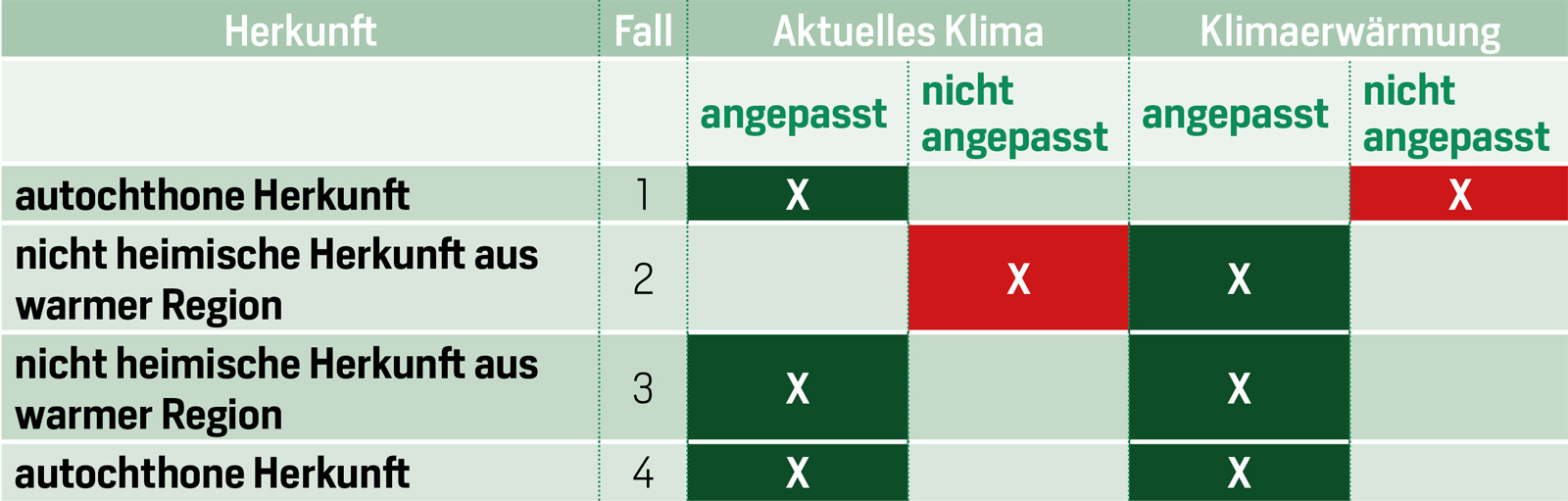Autochthone Herkünfte, die auch mit einem künftig wärmeren und trockeneren Klima gut zurechtkommen, wären die ideale Option (Tab. 1, Fall 4). Bisher belegen nur wenige Herkunftsversuche die Existenz solcher spezieller Ökotypen, die als klimatische Generalisten bezeichnet werden können.