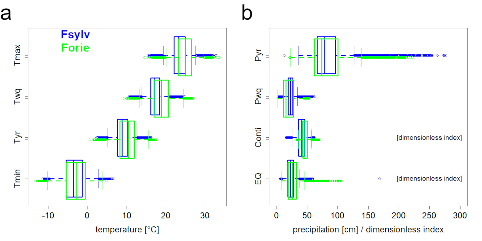 Die klimatischen Verbreitungsgebiete der beiden Schwesterarten überschneiden sich deutlich (Abb. 3). Die Temperatur- und Niederschlagsbereiche zeigen jedoch, dass Orientbuche wärmere und trockenere Klimazonen erreicht als Rotbuche. Die Sommertemperatur (Twq) zeigt die größten Unterschiede mit höheren Werten im Median (+1,8 °C), im dritten Quartil (+2,3 °C) und im oberen Whisker (+4,5 °C). Die entsprechenden Werte für Jahrestemperatur (Tyr) liegen bei 1,5 °C, 1,8 °C und 3,4 °C. Die Minimumtemperatur weist mit einer mittleren Abweichung von +0,8 °C die geringsten Schwankungen auf (Abb. 3 a).