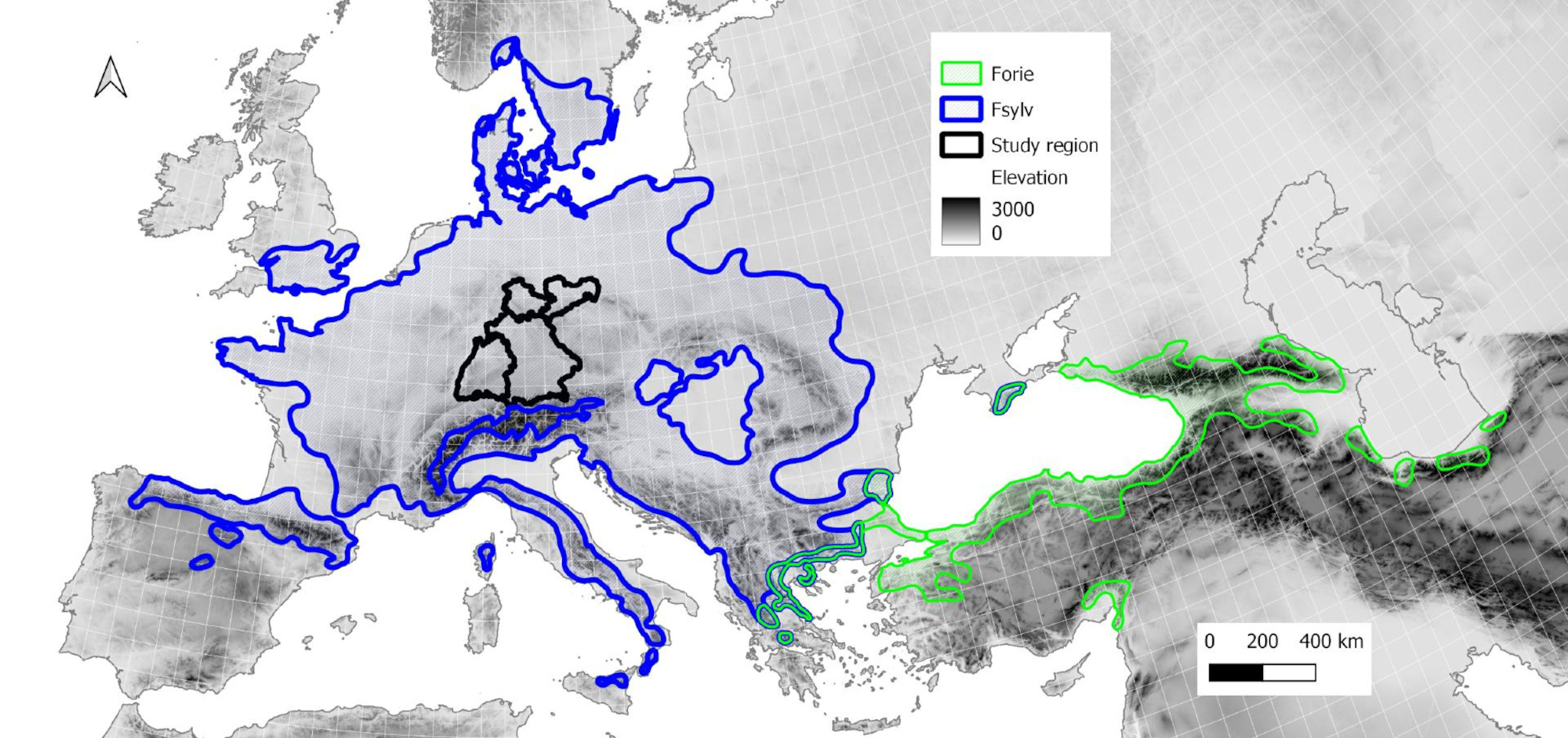 Diese Pilotstudie findet im Rahmen des Projekts sensFORclim statt. Sie zielt darauf ab, die klimatische Anbaueignung der Orientbuche in Süddeutschland zu untersuchen, wobei der Schwerpunkt auf Rotbuchen-Waldstandorten liegt, und stützt ihre Ergebnisse auf makroökologische Daten (deskriptive Statistik, Klimahüllen). In sensFORclim werden mit verschiedenen Methoden (Artverbreitungsmodellen, Dendroökologie, Physiologie und Genetik) und auf verschiedenen räumlichen Skalen (Kontinent, Region, Bestand) nach klimaplastischen Populationen wichtiger Hauptbaumarten gesucht. Die Zielregionen unserer Studie sind vier Bundesländer in Süddeutschland (Baden-Württemberg, Bayern, Thüringen, Sachsen).