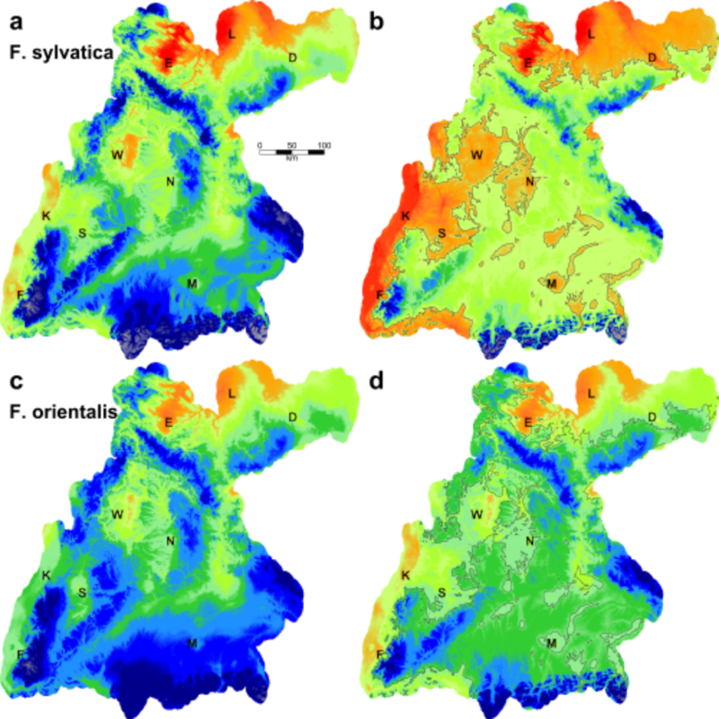 Die derzeitige Eignung von Orientbuche ist ähnlich wie die der Rotbuche. In mehr als 80 % des Untersuchungsgebiets weist die Orientbuche zumindest eine mittlere Eignung auf. Außerdem sind die Grenzgebiete an der feucht-kalten Klimagrenze bei der Orientbuche (höhere Lagen, bläuliche Fläche in Abb. 4c) viel größer (15 %) als die an der trocken-warmen Klimagrenze (1 %) (rot/orange Fläche in Abb. 4a).