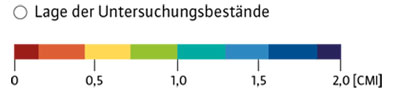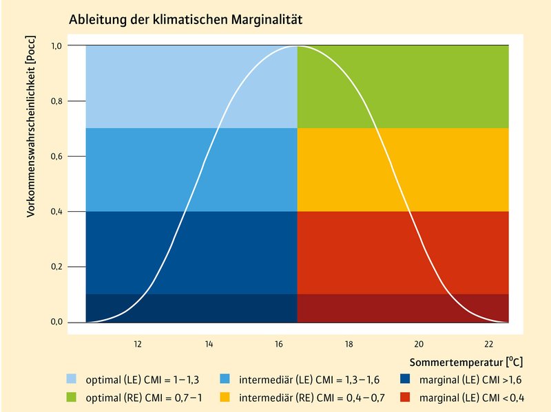 Dies erklärt sich folgendermaßen: Zur Ableitung dieses Maßes wird die Temperatur schrittweise soweit erhöht, bis Pocc am Verbreitungsrand praktisch auf 0 abfällt. Bei Vorkommen im Optimum gilt CMI = 1. Der Wert 2 wird für Vorkommen am Kältepol der Verbreitung (am Leading Edge) erreicht. Ein solches Vorkommen muss bei der klimatischen Annährung zum Rear Edge erst mal auf den "Optimumberg" (Weg auf der Wahrscheinlichkeitsskala ~1) ansteigen (Abbildung 2), um dort vom Gipfel wieder auf 0 abzusteigen. Die Summe der Wegstrecken im Wahrscheinlichkeitsraum bis zum Nischenrand ist demzufolge maximal 2. In "sensFORclim" interessieren jedoch vor allem Standorte, die dem Rear Edge zugewandt sind (rechte Seite der Grafik in Abbildung 2) und deren Marginalität dementsprechend unter 1 liegt. Klassen, aus denen Bestände ausgewählt wurden, liegen in den Bereichen optimal (CMI = 1,0–0,7; grün), intermediär (CMI = 0,7–0,4; gelb) und marginal (CMI = 0,4–0; rot). Bestände im Bereich des Leading Edge (CMI > 1) wurden vorerst nicht einbezogen.