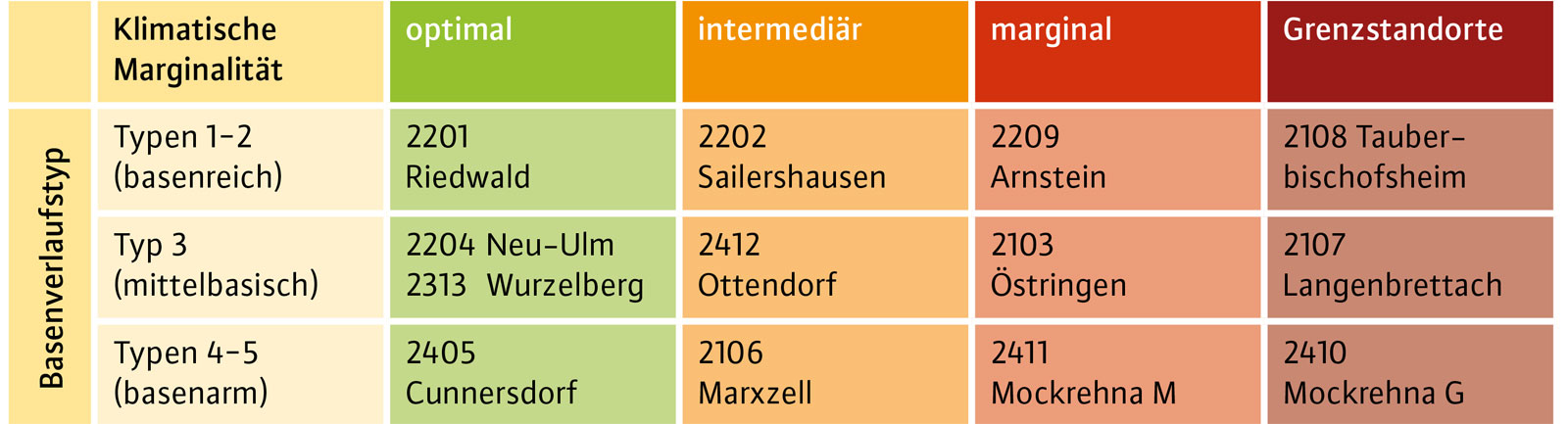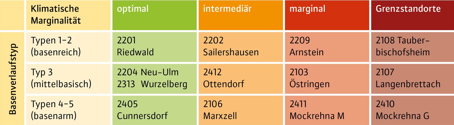 Neben dem Regionalklima im Untersuchungsgebiet wurde ein besonderes Augenmerk auf den lokalen Bodenwasserhaushalt gelegt. Zum einen um eine Überlagerung des Klimas durch Bodeneffekte durch Zuschusswasser zu vermeiden, zum anderen um den standörtlichen Grenzbereich zu definieren, der durch ungünstigen Bodenwasserhaushalt unter marginalen Klimaverhältnissen gekennzeichnet ist. Zur Vermeidung der genannten Überlagerungseffekte wurden grundsätzlich nur terrestrische Standorte ausgewählt. In den Klimastraten marginal bis optimal wurden durchschnittliche bis gute Standorte mit mittlerer bis hoher Wasserspeicherkapazität einbezogen. Die Wasserhaushaltstufe liegt hier i.d.R. im Bereich "mäßig frisch" bis "sehr frisch". Lediglich im Optimalbereich, in dem definitionsgemäß weitgehend unlimitierte Wachstumsbedingungen herrschen, wurde Hangzugwasser toleriert. Grenzstandorte mit geringer Wasserspeicherkapazität bei marginalem Klima erreichen i.d.R. eine Wasserhaushaltsstufe von "mäßig trocken" oder ungünstiger. Diese Standorte stecken die standörtlichen Limits der jeweiligen Baumart zum Trockenen hin ab.