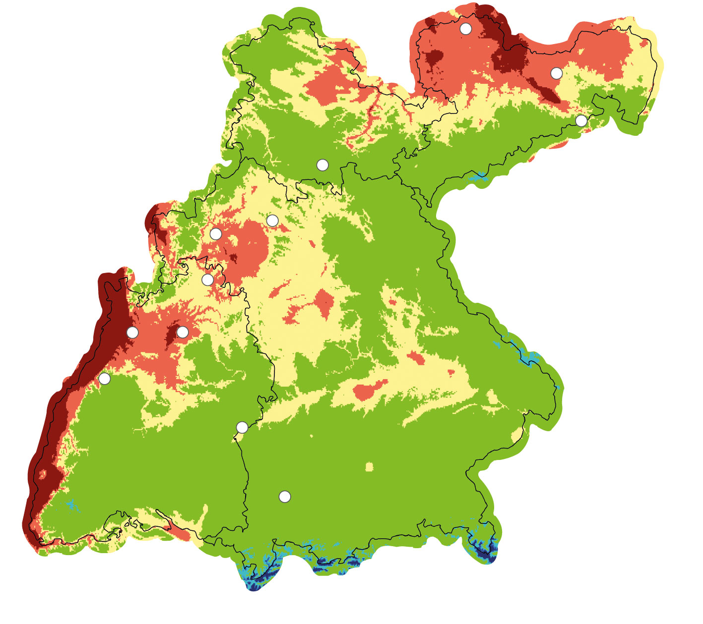 Die Konservierung der aktuellen räumlichen Klimamuster ist bei unserem Ansatz von Vorteil, da wir uns mit der genetischen Basis physiologischer Anpassungen von (autochthonen) Populationen befassen. Eine Entkoppelung der klimatischen Zukunft von der Vergangenheit wäre aber insbesondere für die retro-spektiven Untersuchungen konzeptionell nachteilig. Die CMI + 2,5 der Standorte wird für alle vier Bundesländer flächendeckend berechnet (Abbildung 4).
