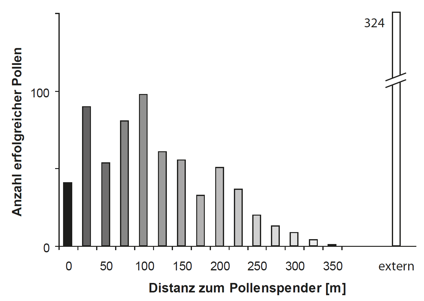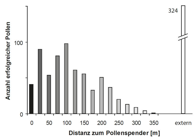 Innerhalb des Bestands beobachteten wir mit zunehmender Distanz zum Mutterbaum eine charakteristische Abnahme der Häufigkeit eindeutig identifizierter, erfolgreicher Pollen (Abb. 3). Die erste Distanzklasse ("0" in Abb. 3) repräsentiert Selbstbefruchtungen, welche immerhin 4% ausmachten. Auf der anderen Seite der Skala sticht der lokale Rekordhalter hervor: Dieses Pollenkorn überwand 345 m. Von wo und wie weit her die externen Pollen mit dem Wind eingeflogen sind, lässt sich nicht feststellen, da wir nur die möglichen Väter innerhalb des Untersuchungsbestands von ca. 9 ha bestimmt hatten. Dass sich unter diesen "Eindringlingen" auch weit Gereiste befinden, ist anzunehmen. So können also Eichenbestände dank des vom Winde verwehten Pollens genetisch im Austausch miteinander stehen, obwohl sie scheinbar weit entfernt stehen.