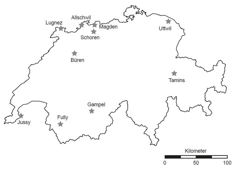 Wie oben ausgeführt, lässt sich zumindest lokal eine gute Übereinstimmung zwischen morphologischen und genetischen Merkmalen finden. In einem nächsten Schritt untersuchten wir, ob dies auch regional so ist, d.h. eine genetische Bestimmung von Eichen dank genetischer Methoden auch über ein grösseres Gebiet und nicht nur für Einzelbestände möglich ist. Dazu bestimmten wir den genetischen Fingerabdruck von jeweils 32 Eichen aus zehn Beständen (Abb. 5).